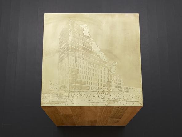 Buildings, rendered as photo-etchings on brass plates, are presented on oak plinths in the style of historical markers. The brass plates serve a dual purpose: to commemorate new buildings and to generate ‘new’ images of the constructions that permeate the landscape. Using the etchings as printing plates, Ganzglass produced a series of large intaglio prints, which hang on the gallery walls near the plinths. While the centuries-old medium of choice seems old-fashioned, the work itself hinges on the process of appropriation, a relatively modern concept in art. In Fence, using a radically different form of appropriation, Ganzglass recreated by hand an iron fence that currently surrounds a public park here in New York. A classic example of early 20th century civic ironwork, thousands of feet of this utilitarian fence border parks around the city. Here in the gallery it is only a fragment but seemingly continues to delineate inside and outside, inclusion and exclusion. With Factory, an industrial laser is used to etch a photograph of a factory interior on a panel of synthetic stone. The image is a composite of multiple wide-angle shots, digitally composited to create a 180° panorama. Here the laser serves as both the focal point for the factory portrait and the technical means through which the image is rendered.