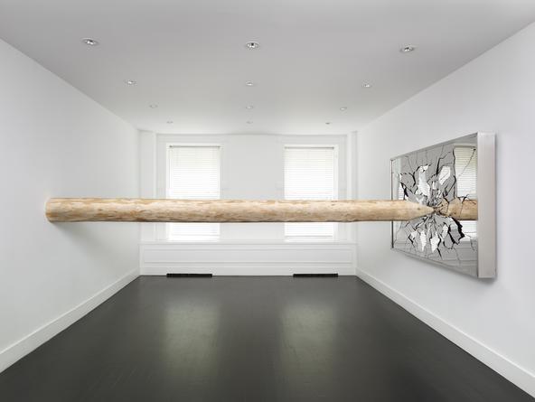 Ksana is presented in two examples. Hui has turned the gallery’s main room into a scene that focuses on the split second when a suspended 500 lb. tree trunk pierces a pristinely shattered mirror-finished steel surface. The result suspends time long enough for the viewer to contemplate the instant two implacable forces meet to create a third. The exhibition’s second example is subtler in approach: a giant, glowing shattered heart is perched precariously on a similarly shattered base. The dichotomy is not strictly material. The destroyed appearance of Broken Heart belies its force, a glowing interior that indicates the persistence of life in the form of a heartbeat. Both works, explosive, theatrical and dissonant as they appear to be, are poetic examples of Hui’s interest in combining Eastern and Western philosophical perspectives. The balance between spiritual and material creates the ‘frozen moment’ of the exhibition’s title.