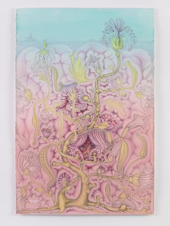 The interior world of Kinke Kooi is rich with associations. At once ultra-feminine, thoroughly organic, suffocating yet teeming with life, Kooi creates highly detailed microcosms that seem to flourish entirely on their own energy. Her palette consists mainly of pastels, pink being the most prominent, and frilly embellishments can be found everywhere. Introduced into this is a good deal of flora, either birthed from or growing over and through various organ-like shapes. The combination can be intense, as if each drawing were grown in a petri dish. Rather than being off-putting, the combination feels sensual, even orgiastic.